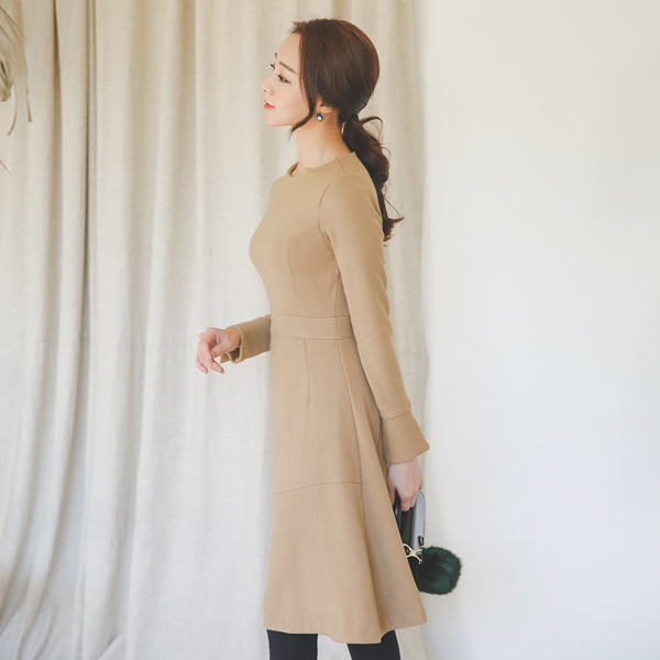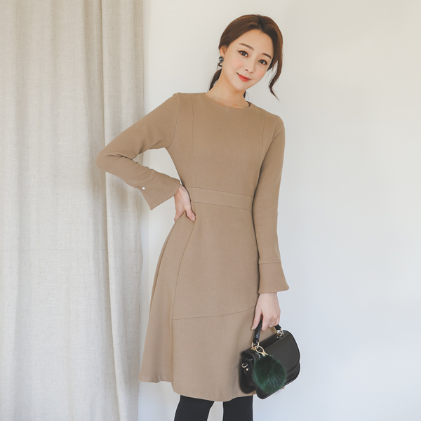 珍珠袖口剪波浪组/喇叭裙连衣裙