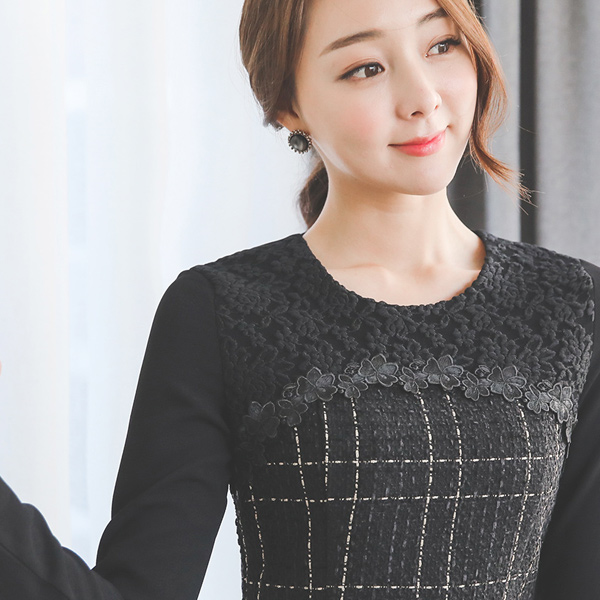 金色花呢花蕾丝连衣裙