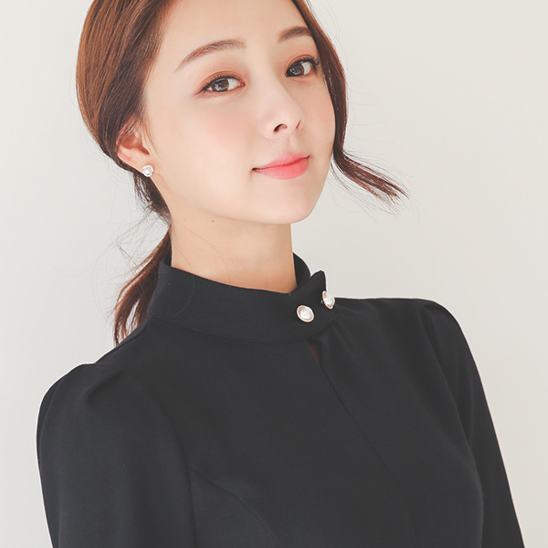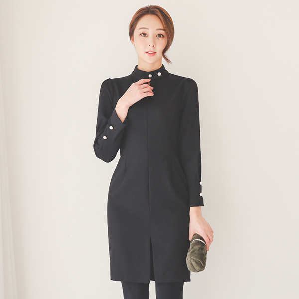 仿珍珠开衩项链脖子连衣裙