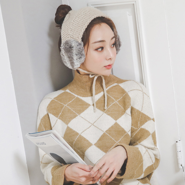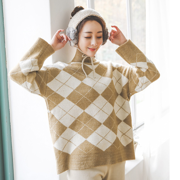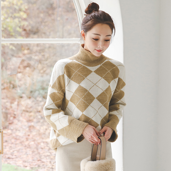 双色菱形花纹高领羊毛针织