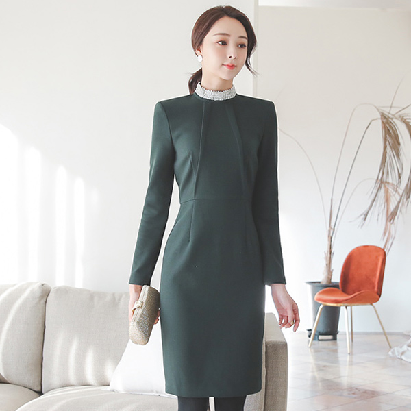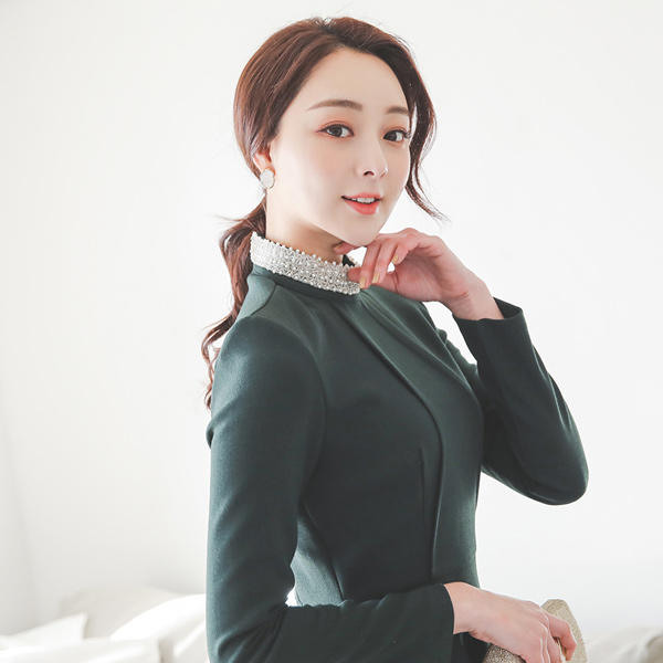 优雅珠脖镖掐连衣裙