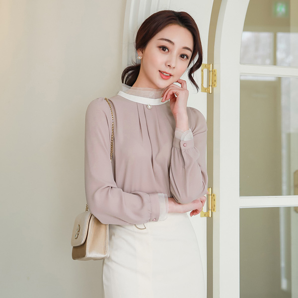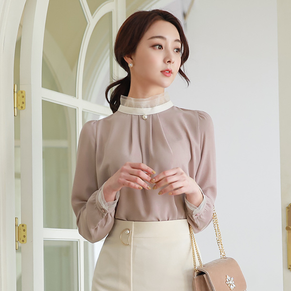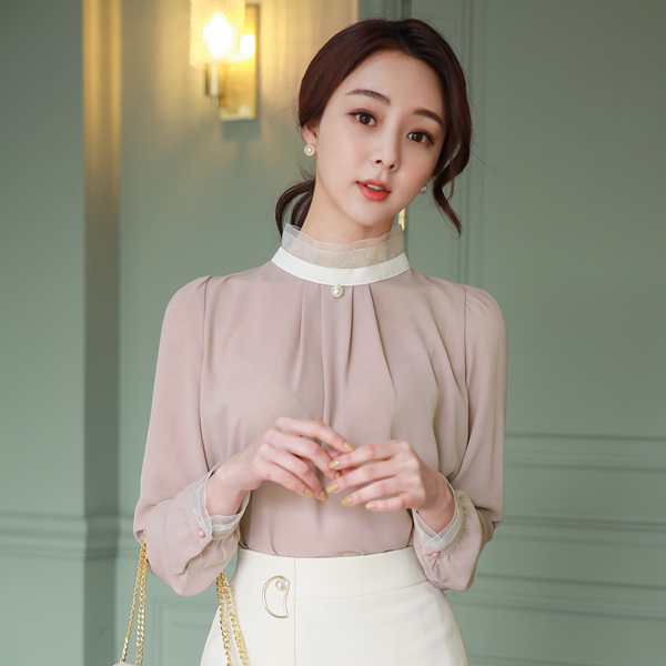 透明硬纱 花边 珍珠 褶皱 女衬衫