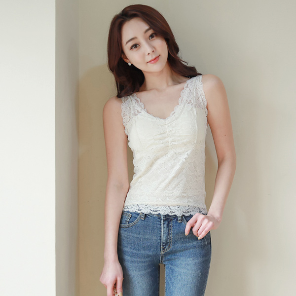 波浪卷V字领褶皱蕾丝背心