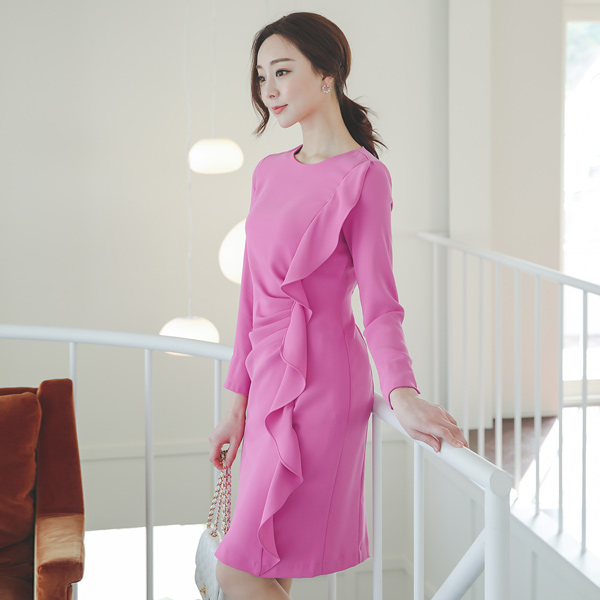品齐褶皱侧纽荷叶圆领连衣裙