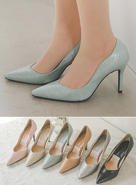 有光泽 蛇皮纹 v 尖头高跟鞋