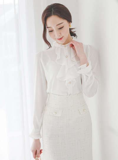 阶梯式 褶裥 珍珠扣 罩衫