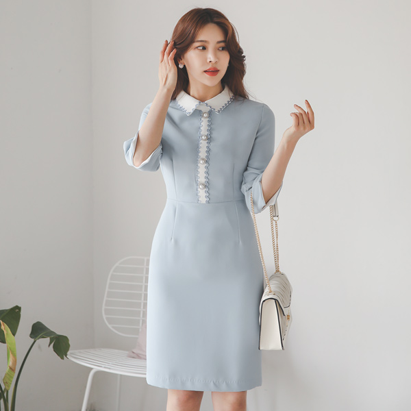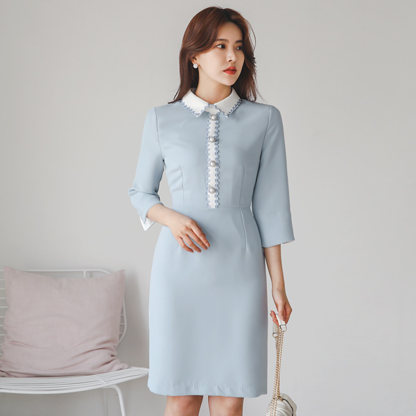波浪卷 珍珠扣 配色领子 连衣裙