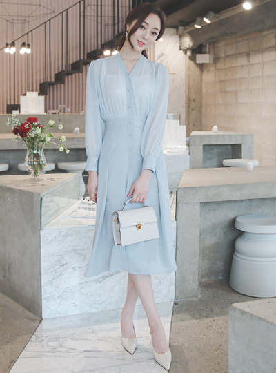 V字领 豆扣 雪纺 喇叭 连衣裙