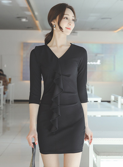 荷叶边 荷叶 V字领 弹力 迷你 连衣裙