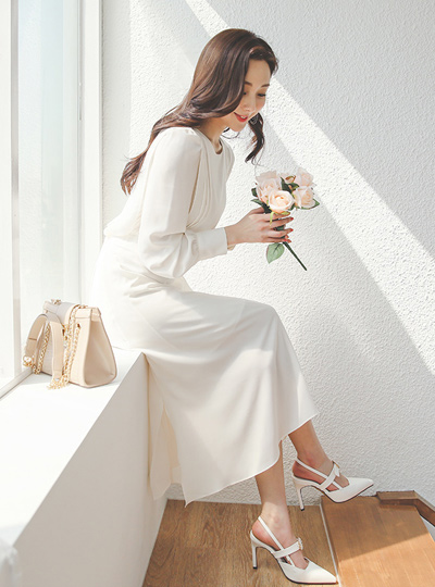 三个 细褶 二重 开叉 喇叭 连衣裙