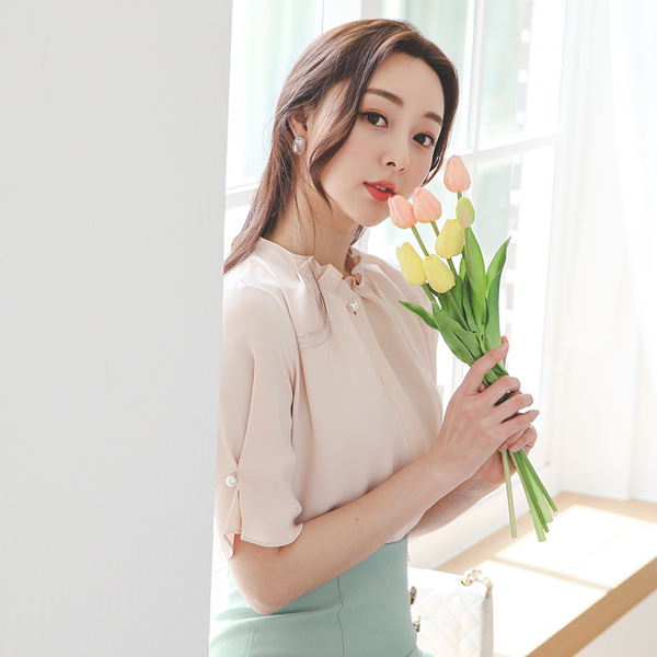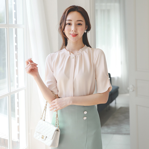 荷叶褶皱领丝滑珍珠罩衫