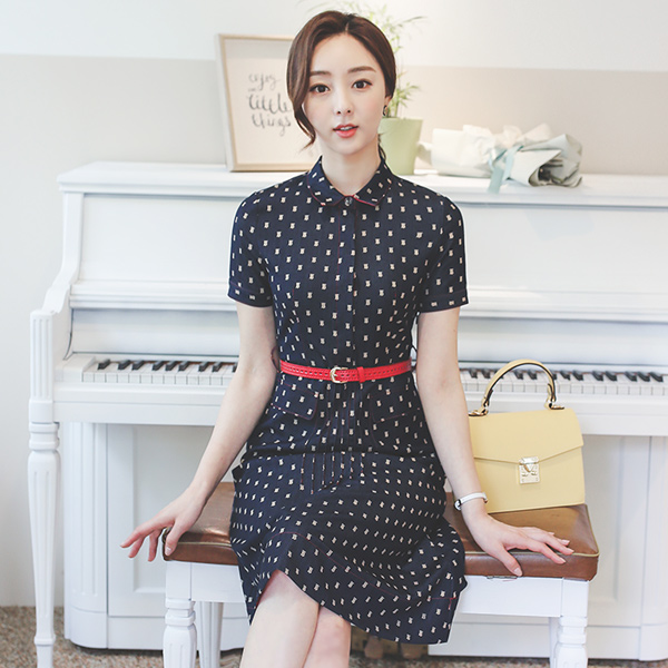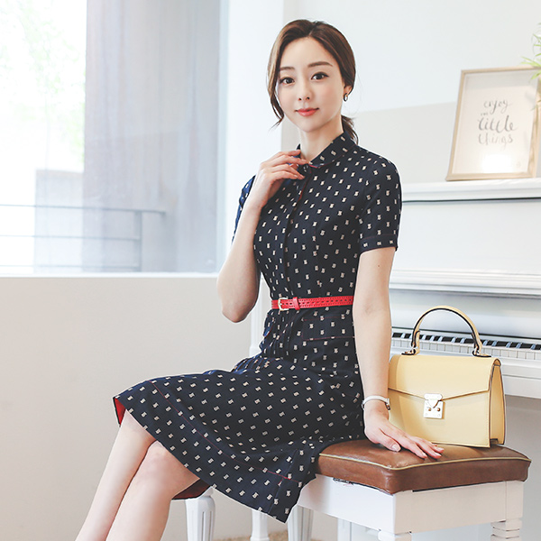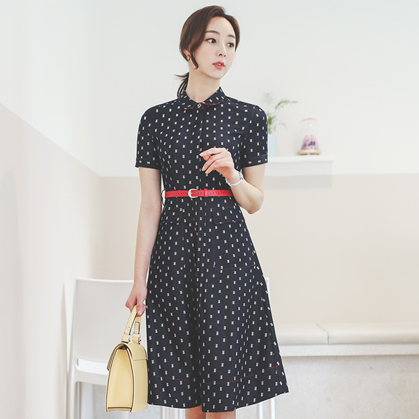 有光泽 牛仔色 束带 喇叭 连衣裙