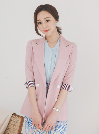 条纹 配色 修身 双 亚麻 夹克