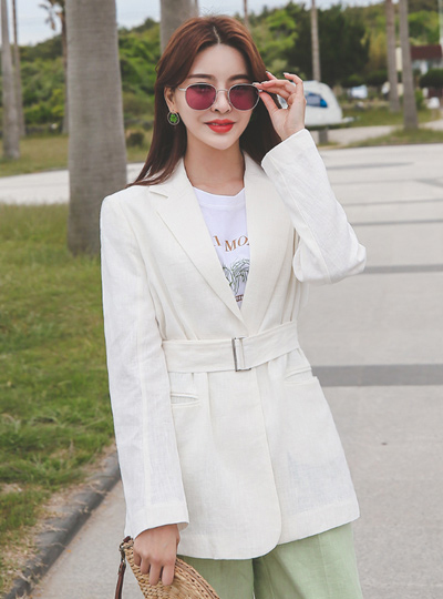 基本 修身 方形 束带 亚麻 夹克