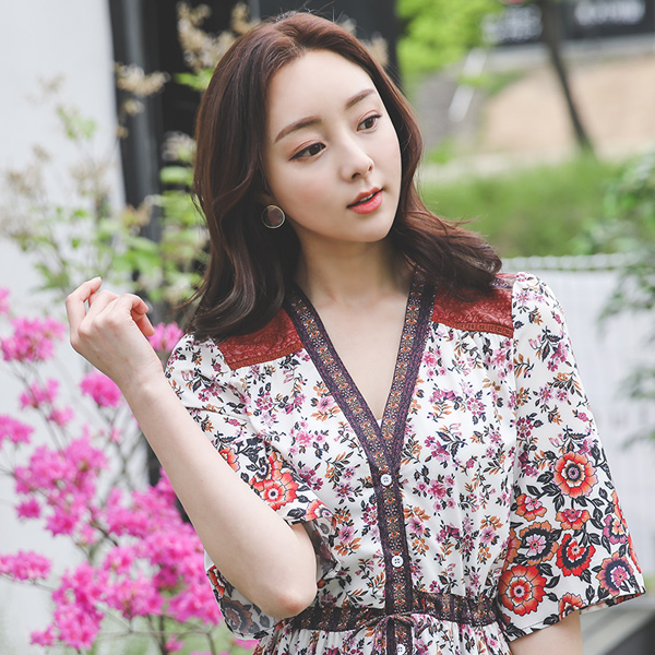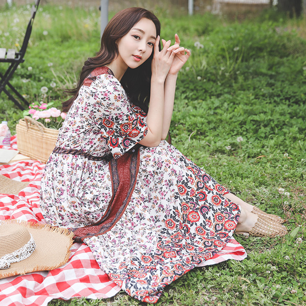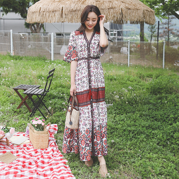 民族风 花纹 流苏 抽绳 超长 连衣裙