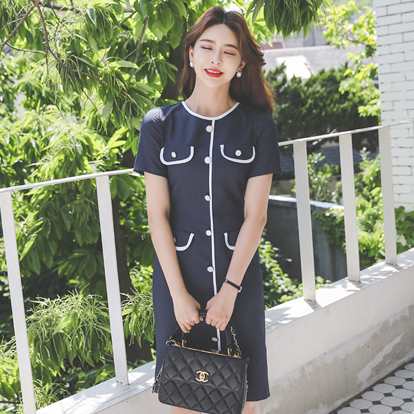 斜纹 口袋 纽扣线条 弹力 连衣裙