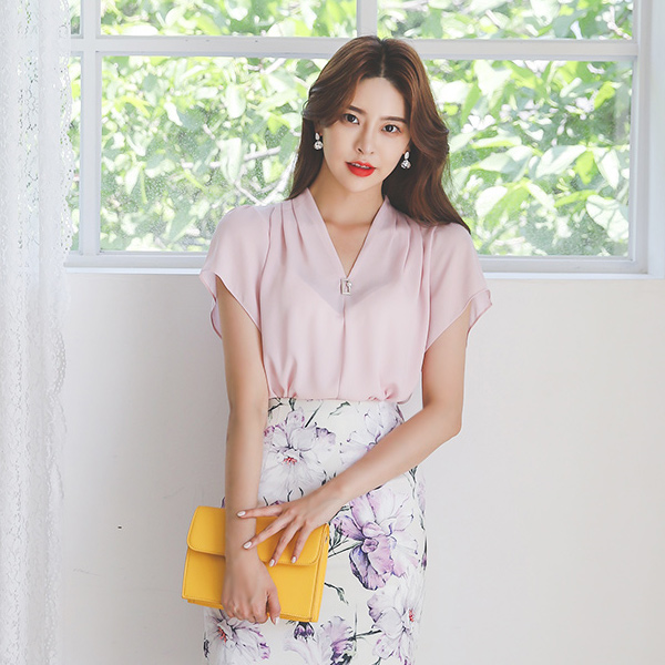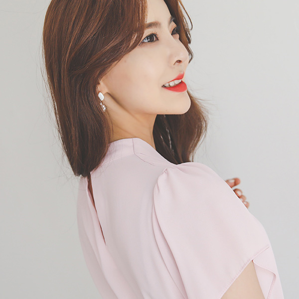 褶皱 V字领 珍珠方形 翅膀 罩衫