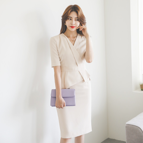Pelisse V字领 荷叶边 弹力 连衣裙