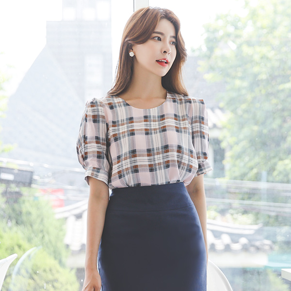 细褶 泡泡袖 格子 配色 罩衫