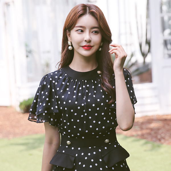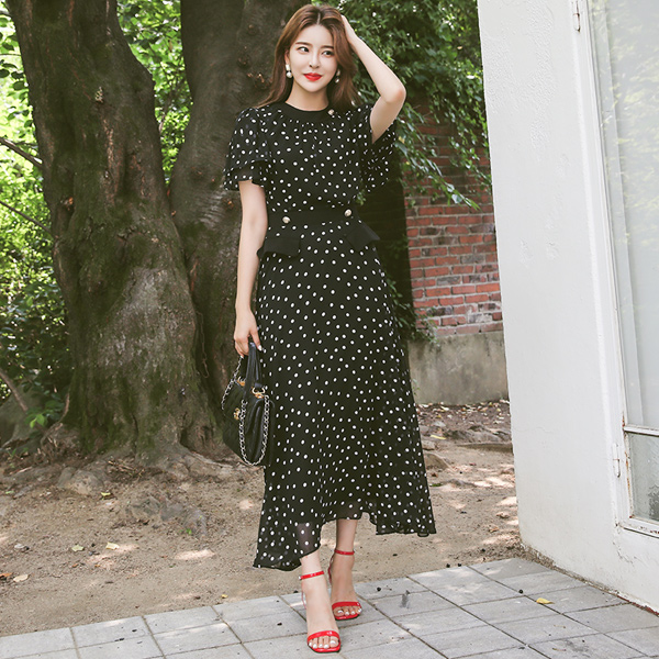 金色纽扣 口袋 雪纺 圆点 ロングワンピース(夏)