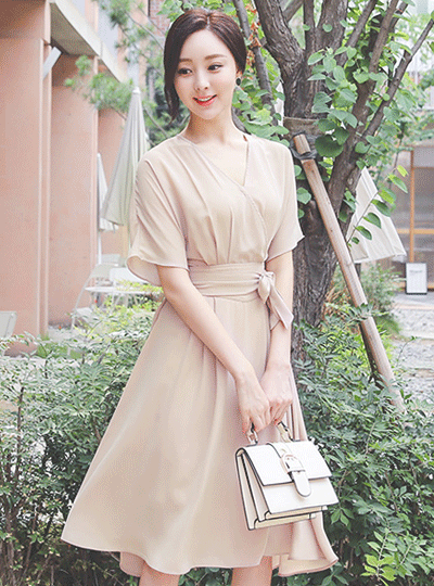 纯正 雪纺 束带 交叉式喇叭 连衣裙
