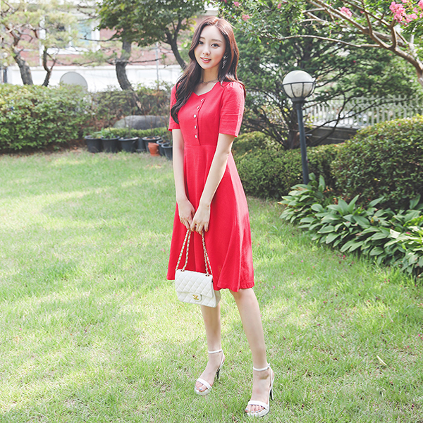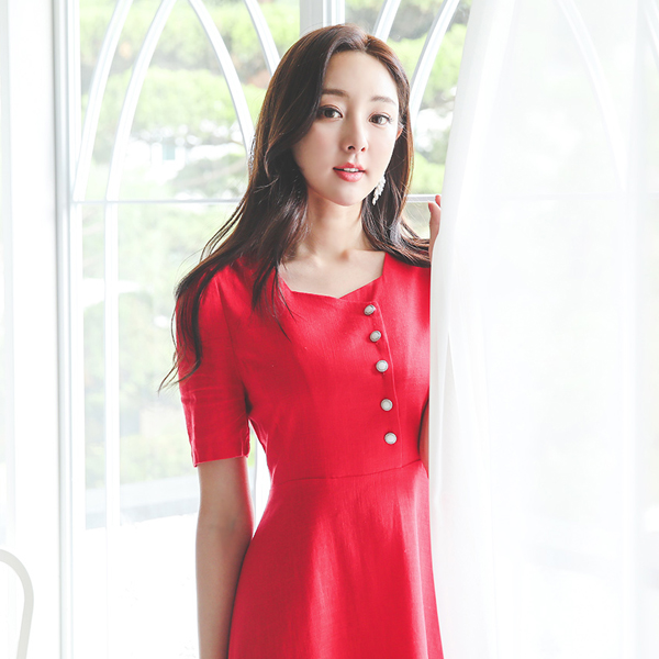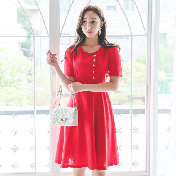 方领 扣子 点缀 A字型 亚麻 连衣裙