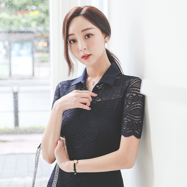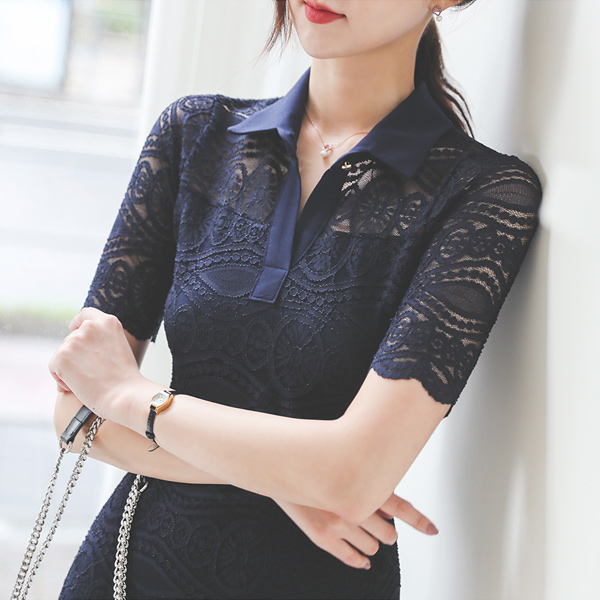 镶钻 领子 修身 弹力 蕾丝 连衣裙
