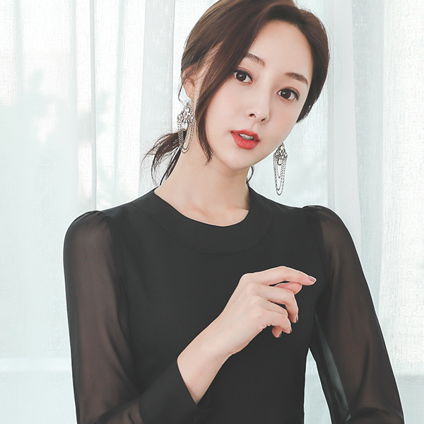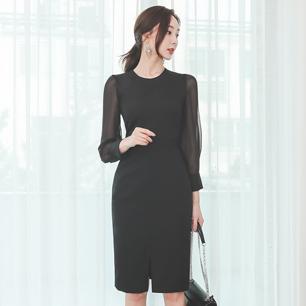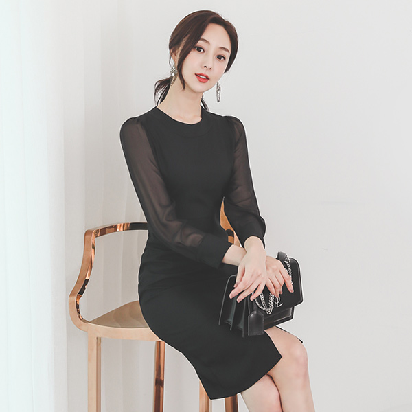 摩登 透视 袖子 开衩 连衣裙