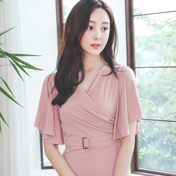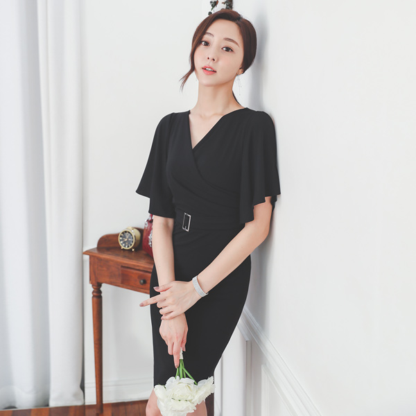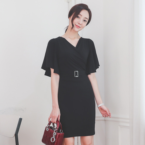 飞袖 开衩 束带 裹身 修身 弹力 连衣裙