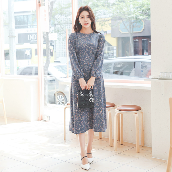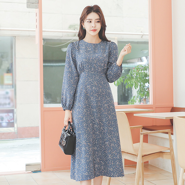 指小 花纹 抽绳 喇叭 连衣裙
