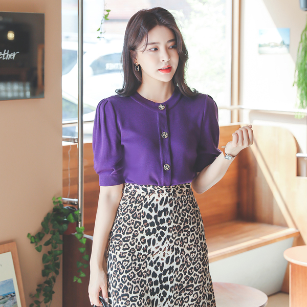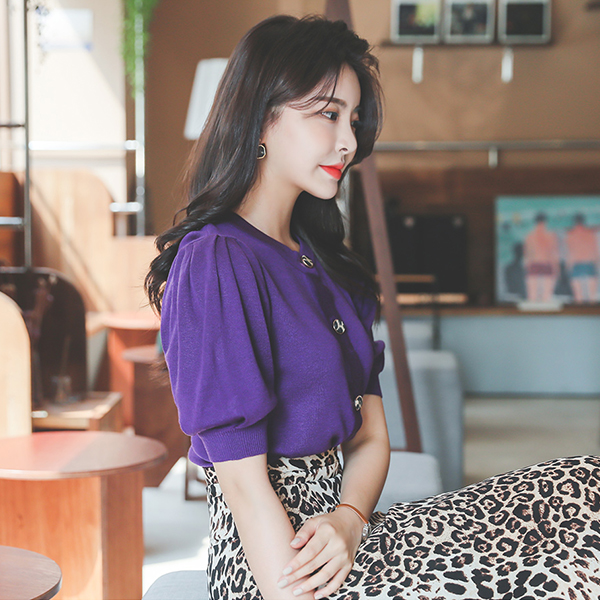豹纹 点缀 泡泡袖 针织衫 开衫