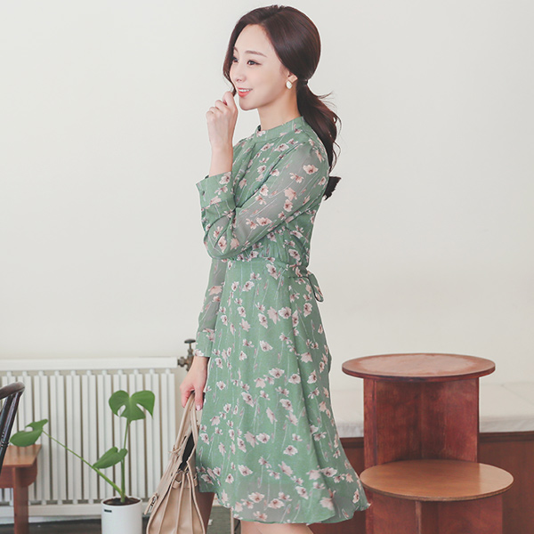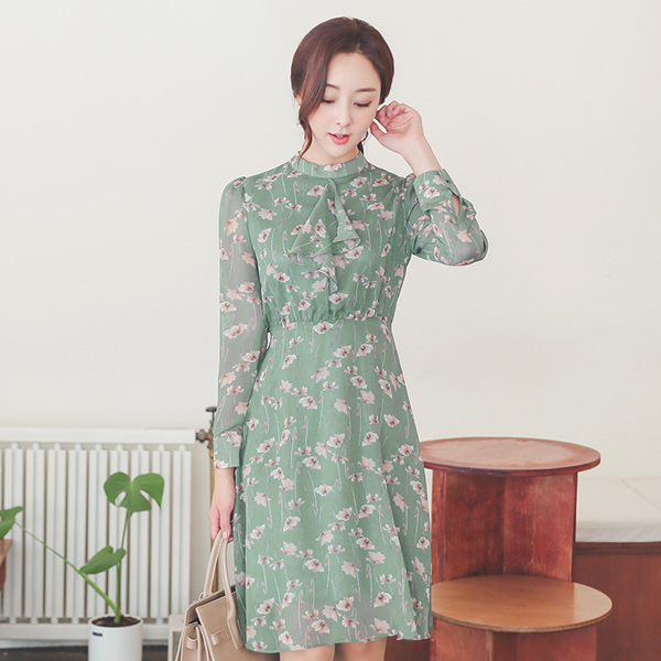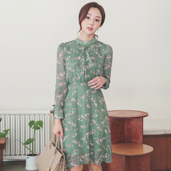 浪漫 花纹 褶裥 훌 雪纺 连衣裙(fall)