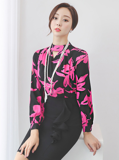 玫瑰色 开叉 褶皱领 罩衫