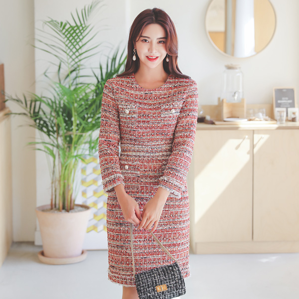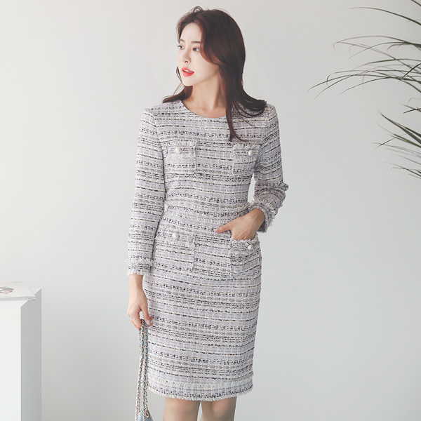勒内 珍珠粗花呢 珍珠装饰口袋 连衣裙