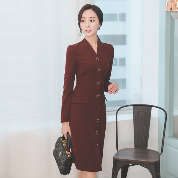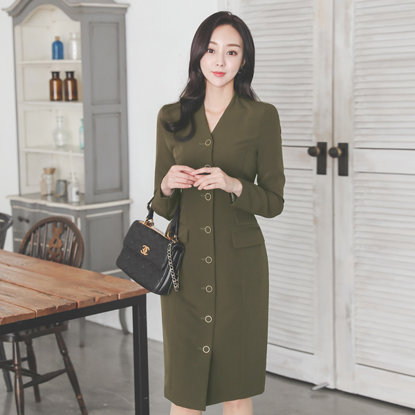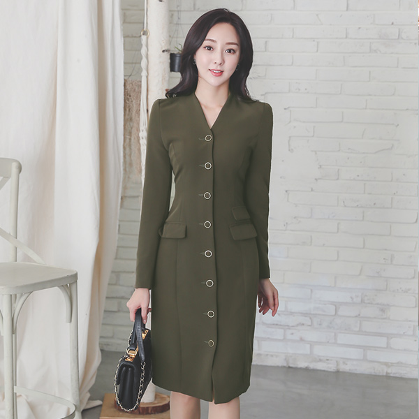 V字领 不规则 口袋 修身 连衣裙