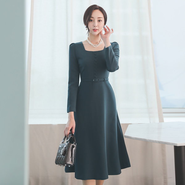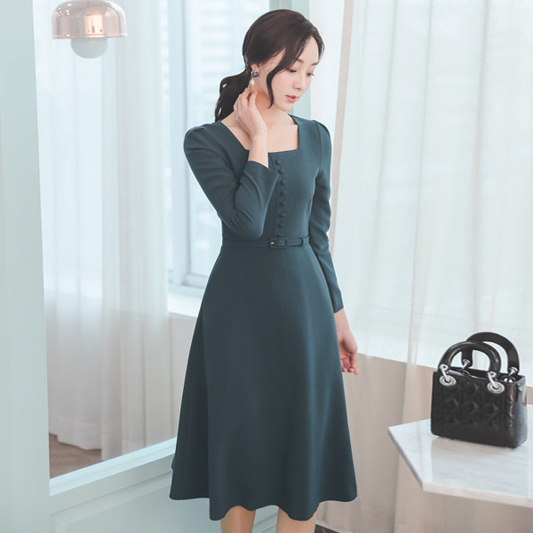 方领 修身 束带 豆扣 A字型 连衣裙