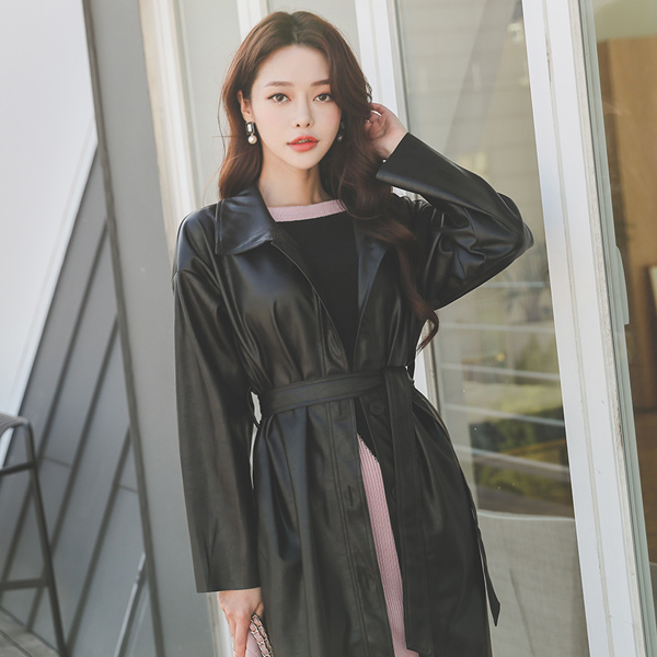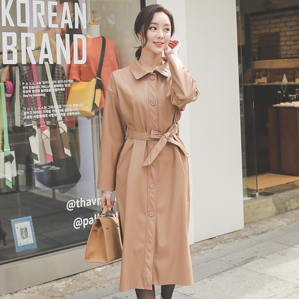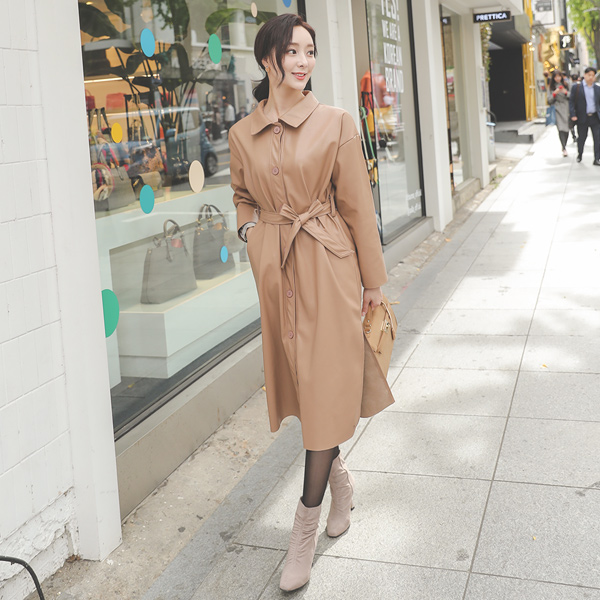 人造皮夹 单排扣 束带 领子 长款大衣