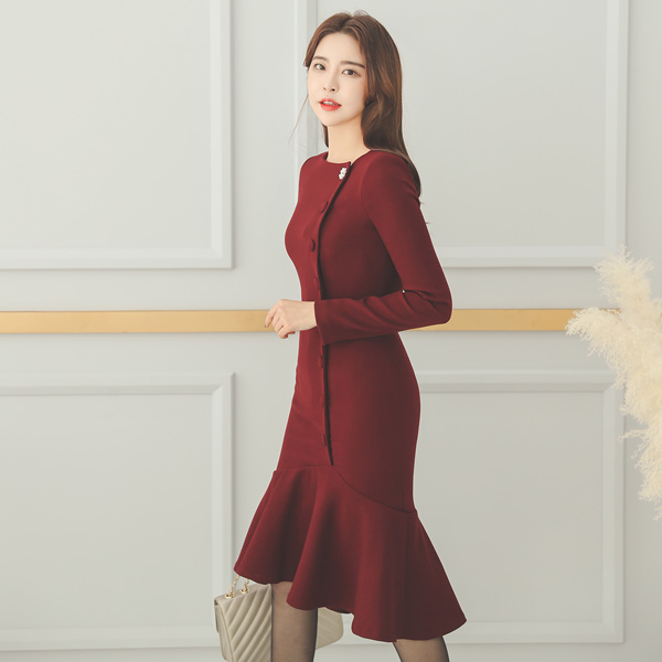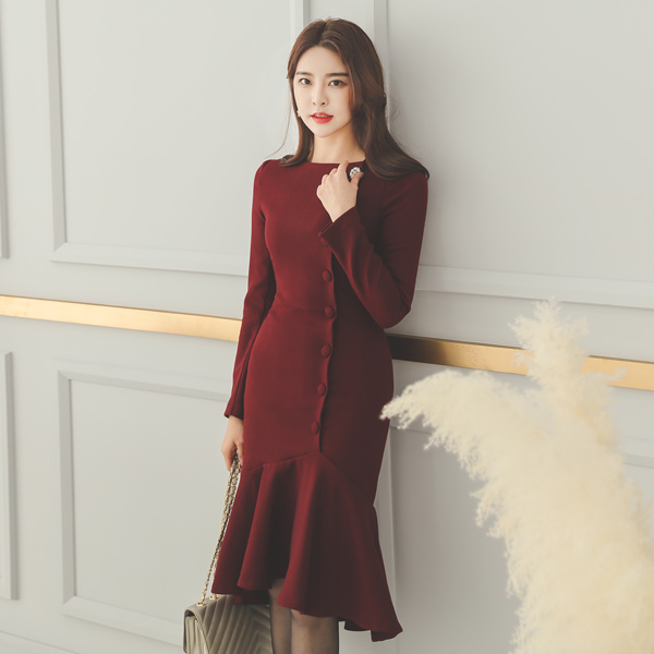 侧纽 细褶 扣子 点缀 褶裥 弹力 连衣裙