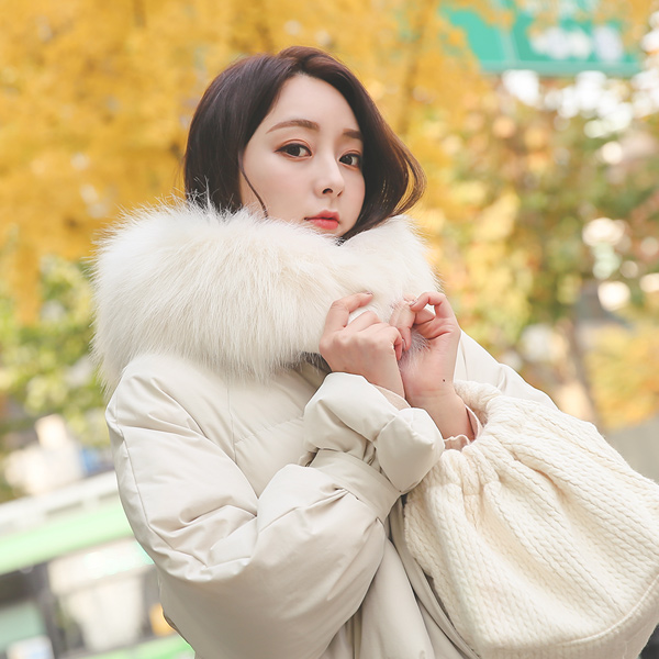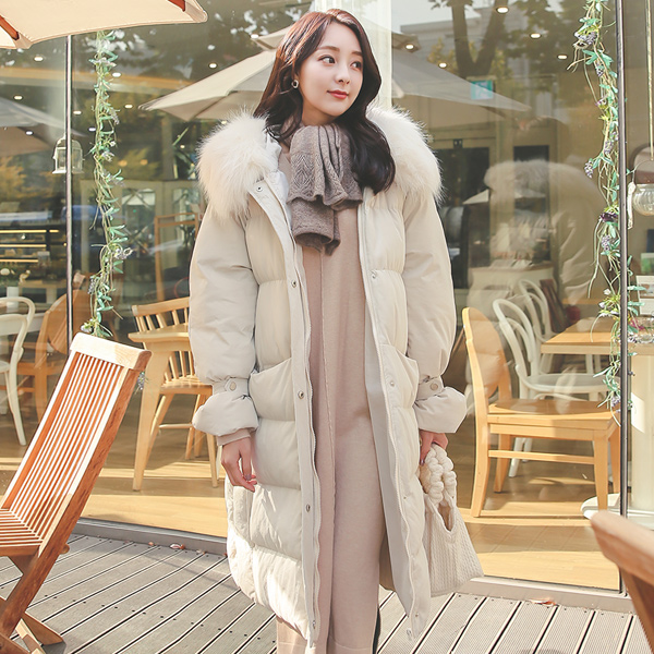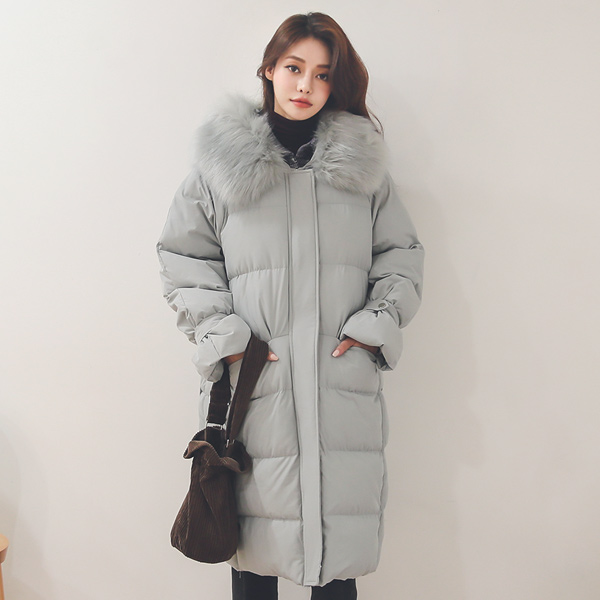 鸭绒 毛帽子 压花 绗缝 长款羽绒服
