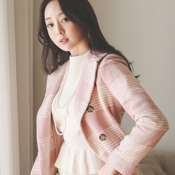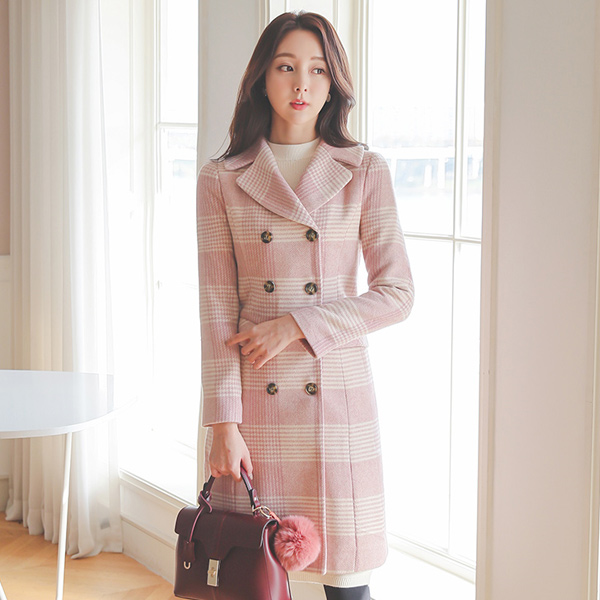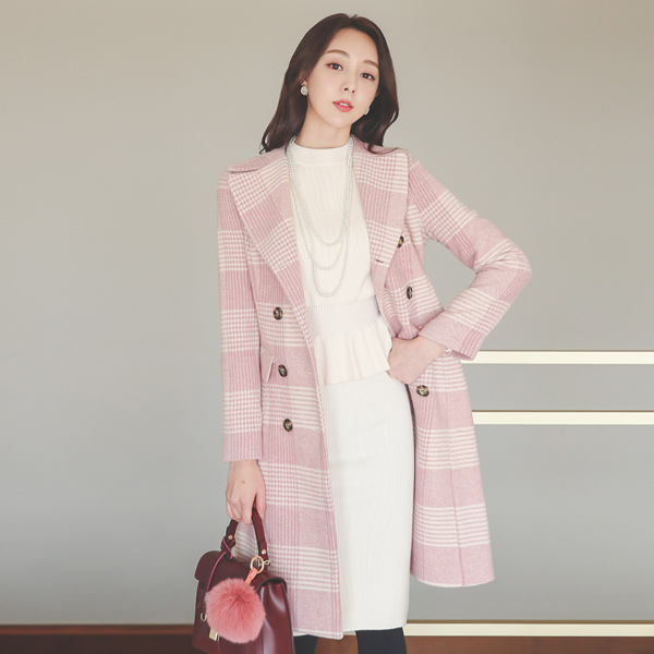 柔色 黑白格子 双排扣 羊毛大衣