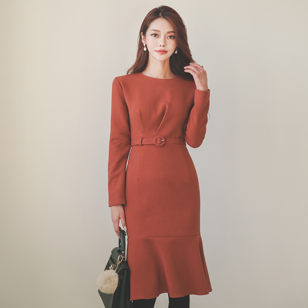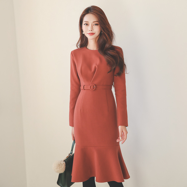 品齐褶皱 束带 美人鱼 拉绒 连衣裙