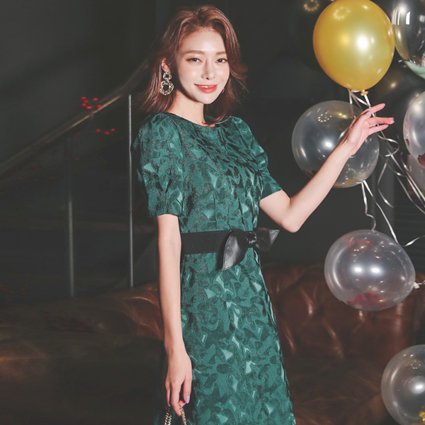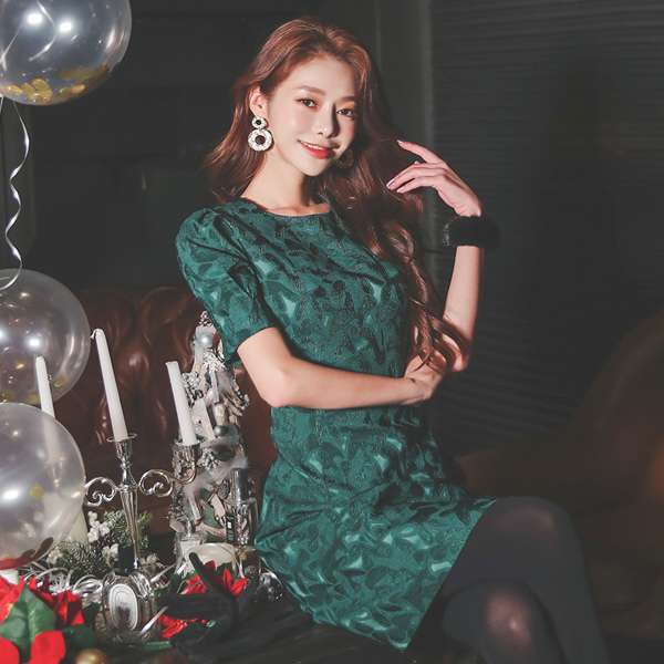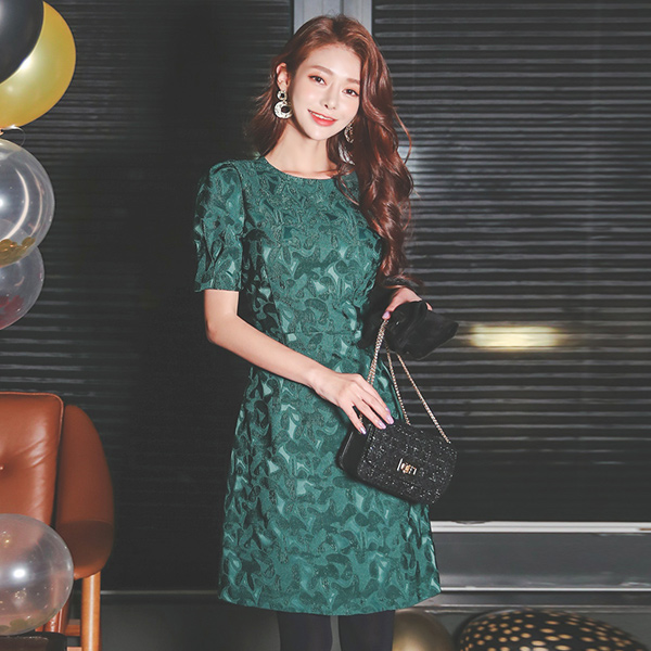 绸缎 提花 泡泡袖 A字型 连衣裙