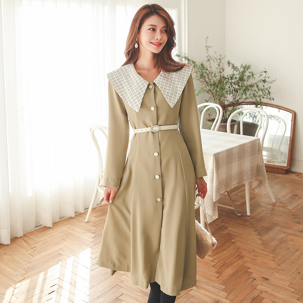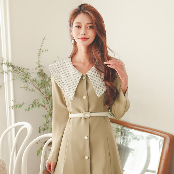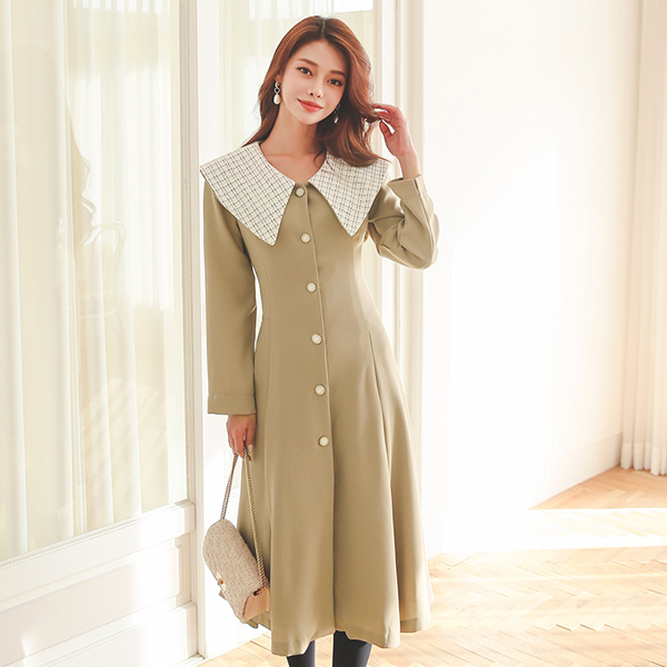 粗呢 水手 领子 샤인버튼 喇叭 连衣裙