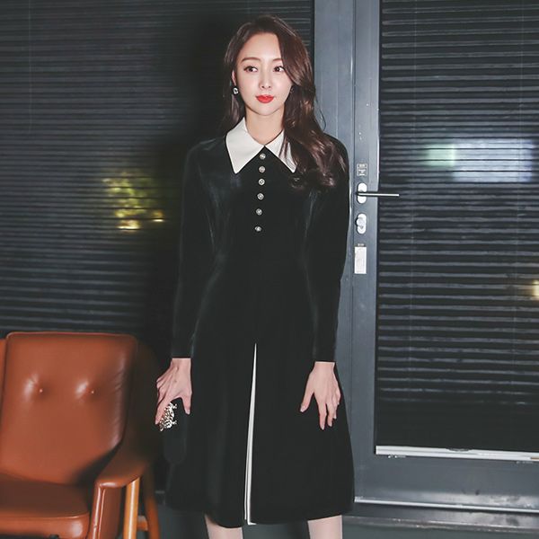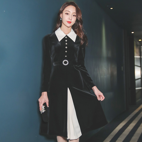 丝绒 珍珠环 腰带 领子 配色 褶边 连衣裙