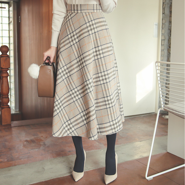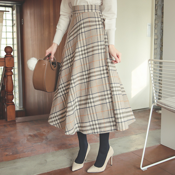 格子 格子 后侧松紧带 羊毛 喇叭 裙子