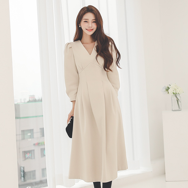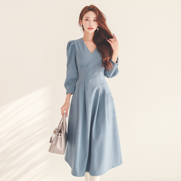 皇冠 V字领 细褶 泡泡袖 A字型 连衣裙