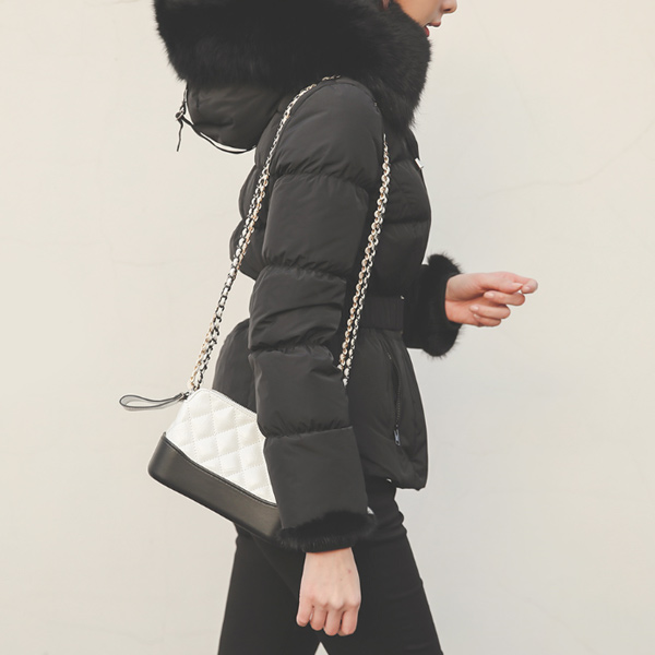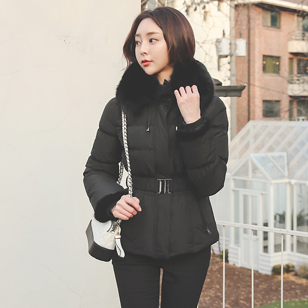 狐狸毛 绗缝 褶皱腰带 鸭绒 短羽绒服