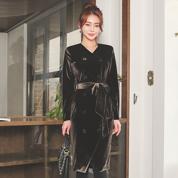 罗郎 丝绒 束带 扣子 Surplice 连衣裙