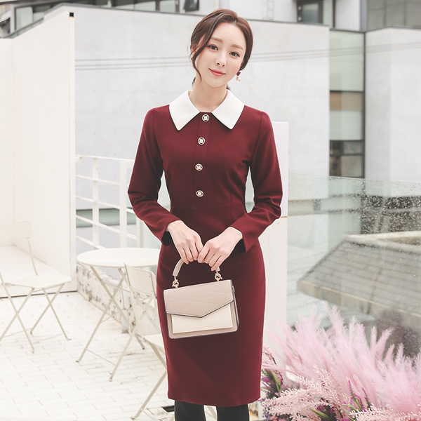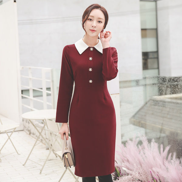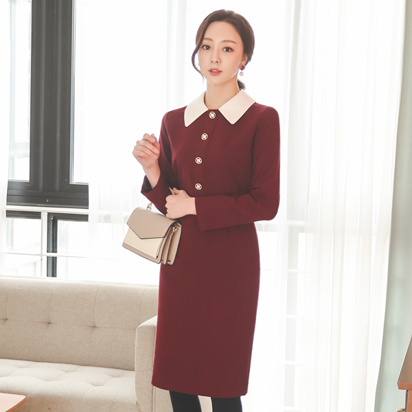 黄金环 珠宝钮扣 领子 配色 连衣裙