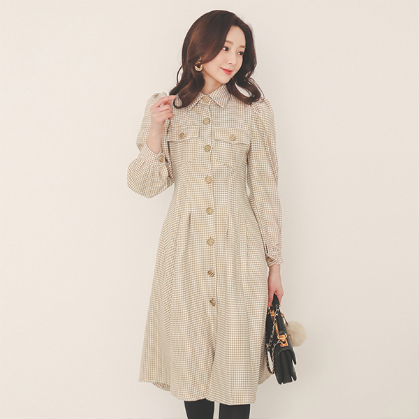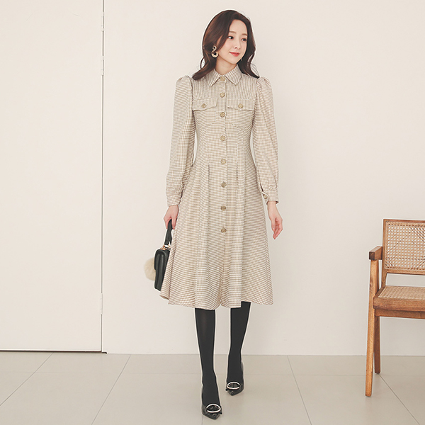 犬牙 泡泡袖 金圈 束带 A字型 连衣裙